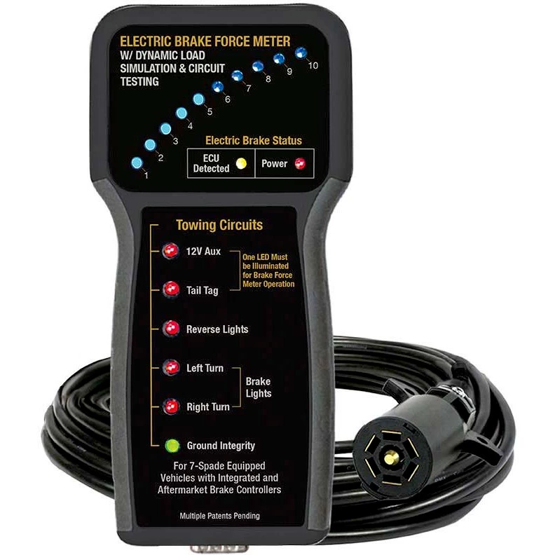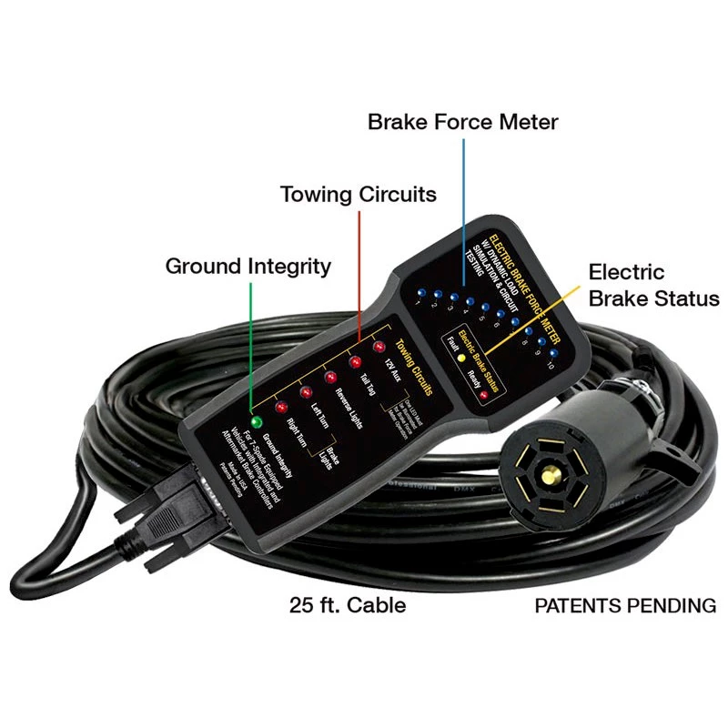 - 25 ft. cable allows one-man, in-cab testing of brake controller and all truck-side tow circuits, e.g. tail lights, turn signals, electric brakes, etc.