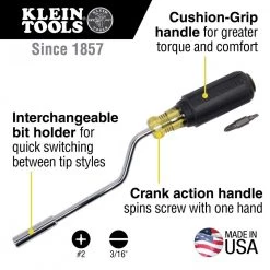 - Klein Tools 2-in-1 Screwdriver saves time and effort, especially on long-threaded screws used with switch plates and light fixtures