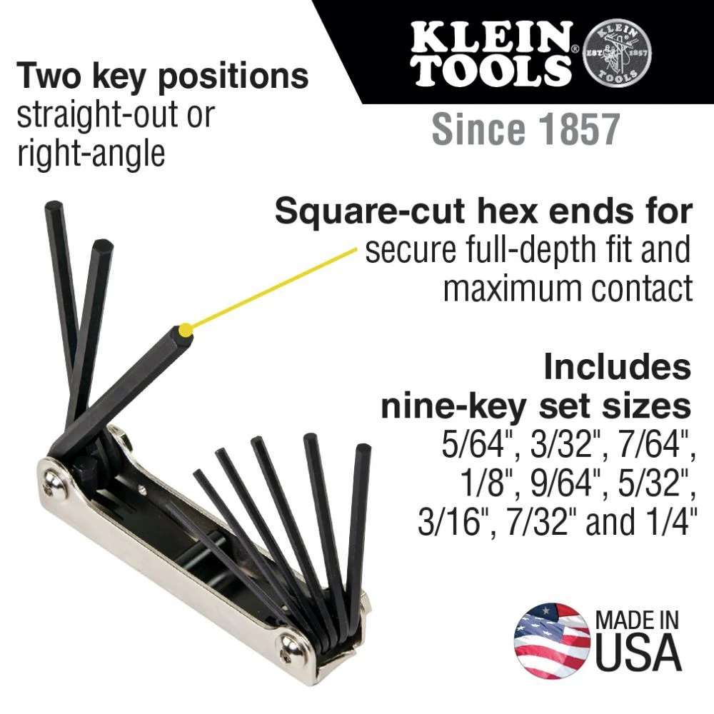 - Includes 9 Key set sizes: 5/64 in., 3/32 in., 7/64 in., 1/8 in., 9/64 in., 5/32 in., 3/16 in., 7/32 in., and 1/4 in.