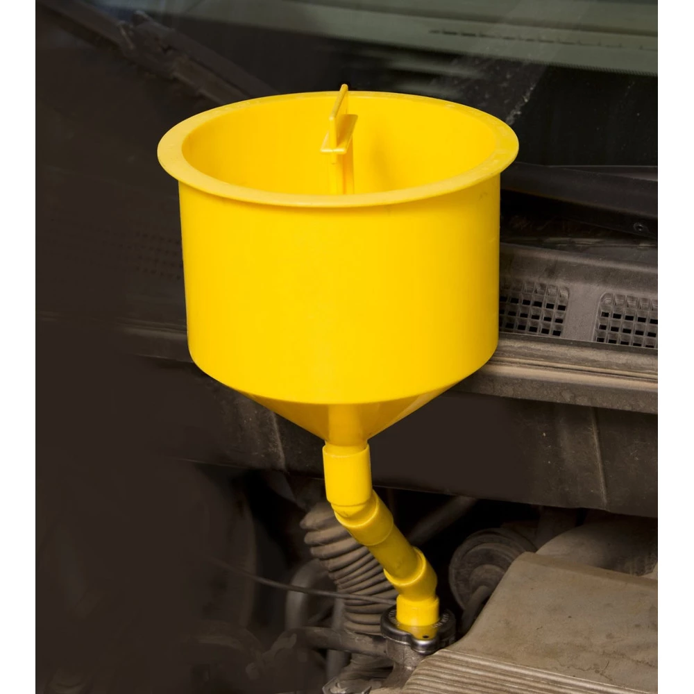 - The funnel eliminates squeaky belts caused by coolant overflow and protects the environment